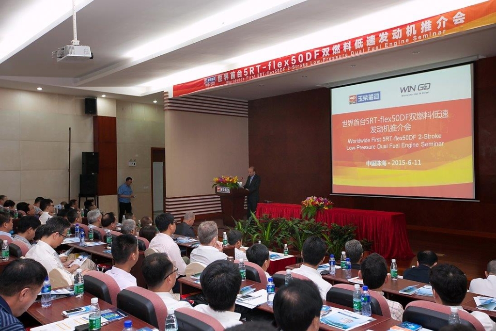 近日,世界首臺投入商業(yè)運營的5RT-flex50DF船用雙燃料低速發(fā)動機在玉柴船動成功交驗。2015年6月11日,玉柴船動舉行了5RT-flex50DF雙燃料低速機客戶日活動,船東、船廠、設(shè)計院、船級社、供應(yīng)商、同行造機廠、專利公司等各界代表共計300多人參加活動,受到了行業(yè)內(nèi)各方的廣泛關(guān)注。